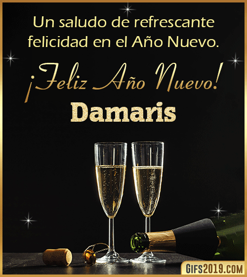 Feliz Año Nuevo Damaris. Sorprende a Damaris con este hermoso detalle para desearle un Feliz Año Nuevo. Tenemos imágenes personalizadas con su nombre, gifs de copas de champagne con frases de año nuevo, perfectas para compartir en redes sociales como Facebook, WhatsApp, Instagram y TikTok.